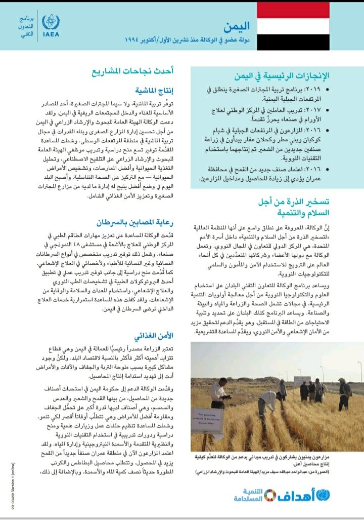 وفيما يلي تقرير الوكالة الدولية للطاقة الذرية للإنجازات الرئيسية في اليمن من خلال برنامج التعاون التقني خلال الاعوام المنصرمة من ٢٠١٦ الى ٢٠١٩م استنادا الى البيانات المتاحة للوكالة ابريل ٢٠٢٠م