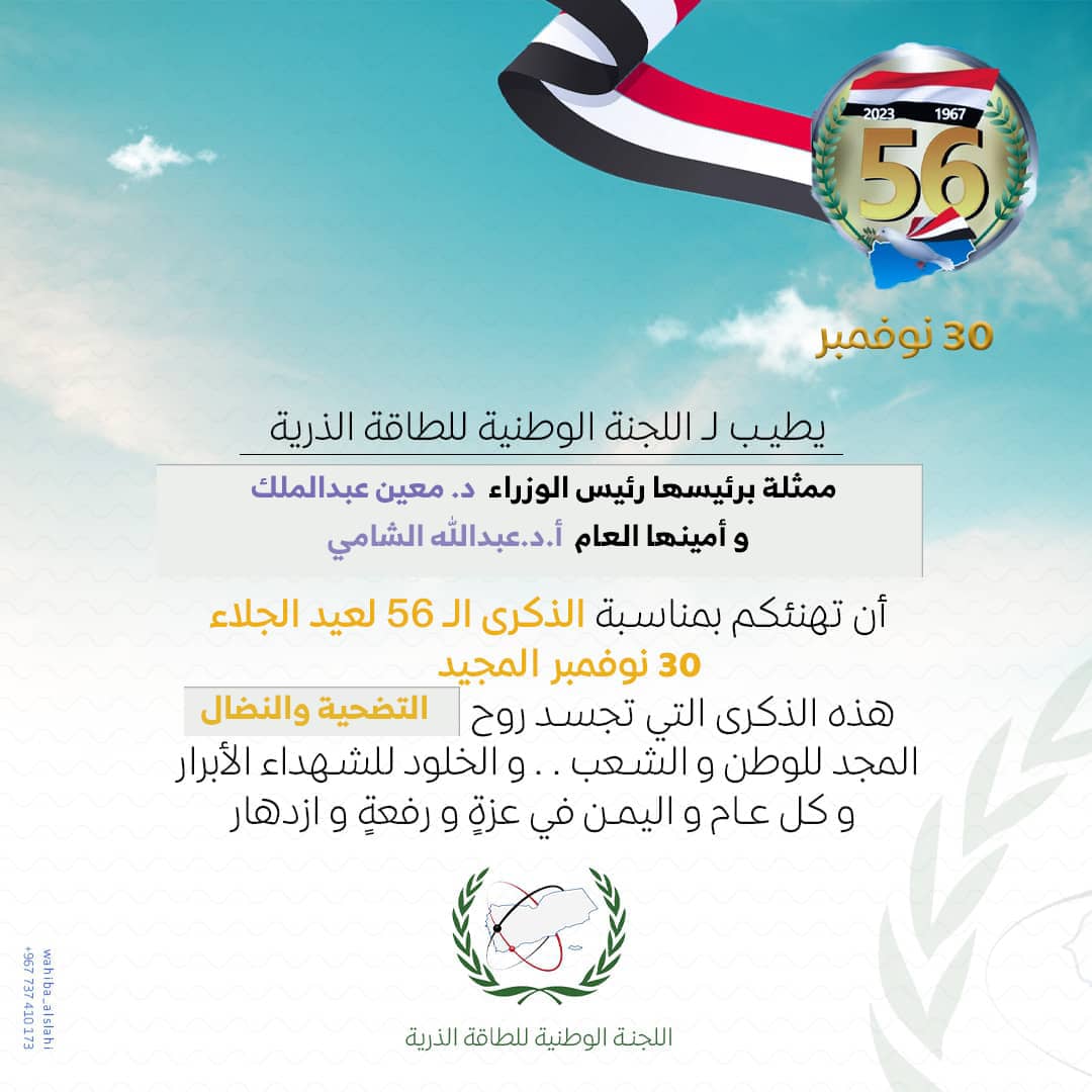 يطيب للجنة الوطنية للطاقة الذرية ممثلة برئيسها رئيس الوزراء د. معين عبدالملك وأمينها العام أ.د عبدالله الشامي، أن تهنئكم بمناسبة الذكرى الـ56 لعيد الجلاء ال 30 من نوفمبر المجيد.