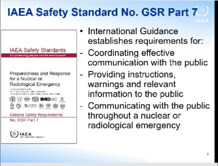 – ايضا تشجيع صناع القرار / القائمين بالاتصال على ضرورة أن يكونوا ذو كفاءة عالية وقادرين على التأهب والاستجابة لحالات الطوارئ النووية/ الإشعاعية ومؤهلين وفقا للمعايير الدولية بحيث يتم اتخاذ إجراءات وقائية وإجراءات استجابة أخرى لها تحت أي ظرف من الظروف لتجنب أو تقليل الآثار الحتمية الشديدة وكذلك الإجراءات الوقائية وإجراءات الاستجابة الأخرى في حالات التعرض وفي حالات الطوارئ ومن اجل تقليل مخاطر الآثار العشوائية بشكل معقول.